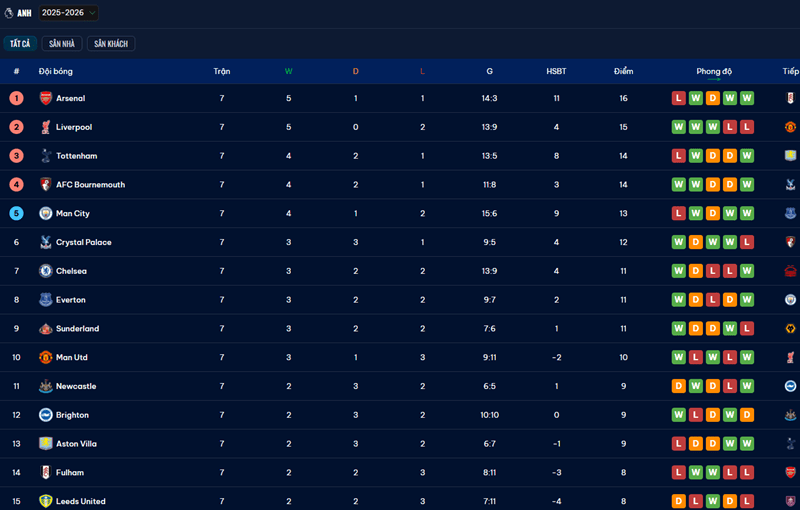 - Khi đội đầu bảng như Man City hay Liverpool tăng tốc, bạn sẽ thấy con số điểm nhảy lên, vị trí đổi màu.